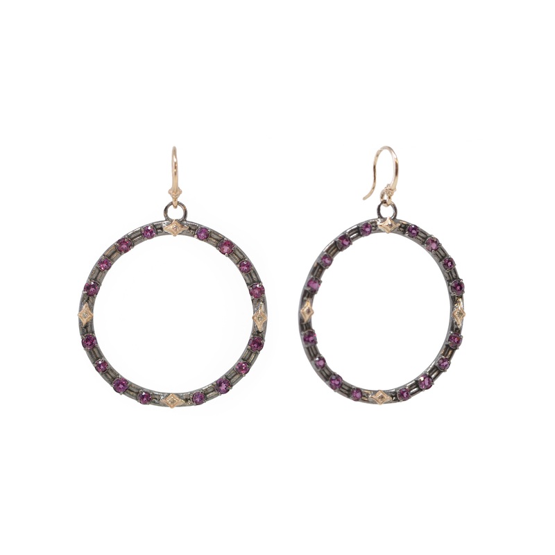 14k Rose Gold and Grey Sterling Silver Crivelli Open Circle Drop Earringswith 0.04 CT Champagne Diamonds and Purple Garnets.