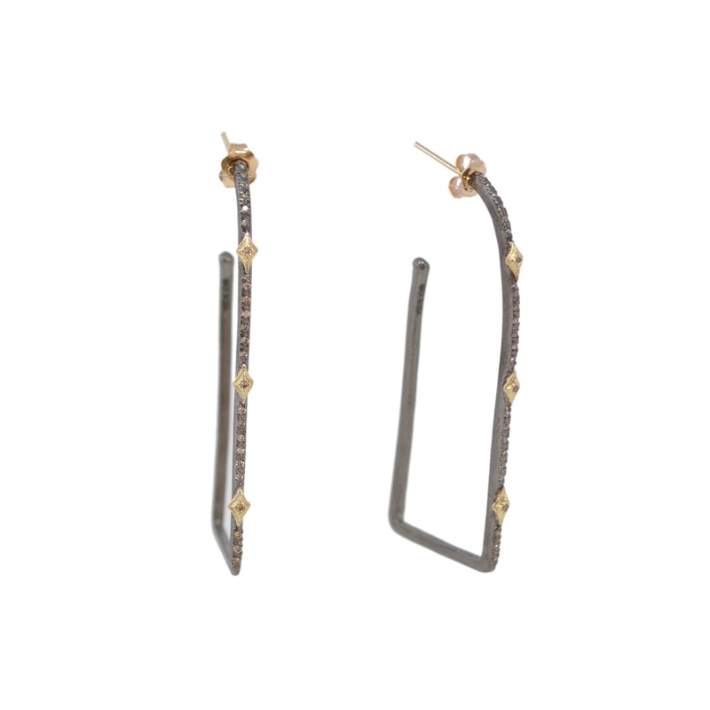 18k Yellow Gold and Blackened Sterling Silver 52mm square hoop earring with crivelli and champagne diamonds.