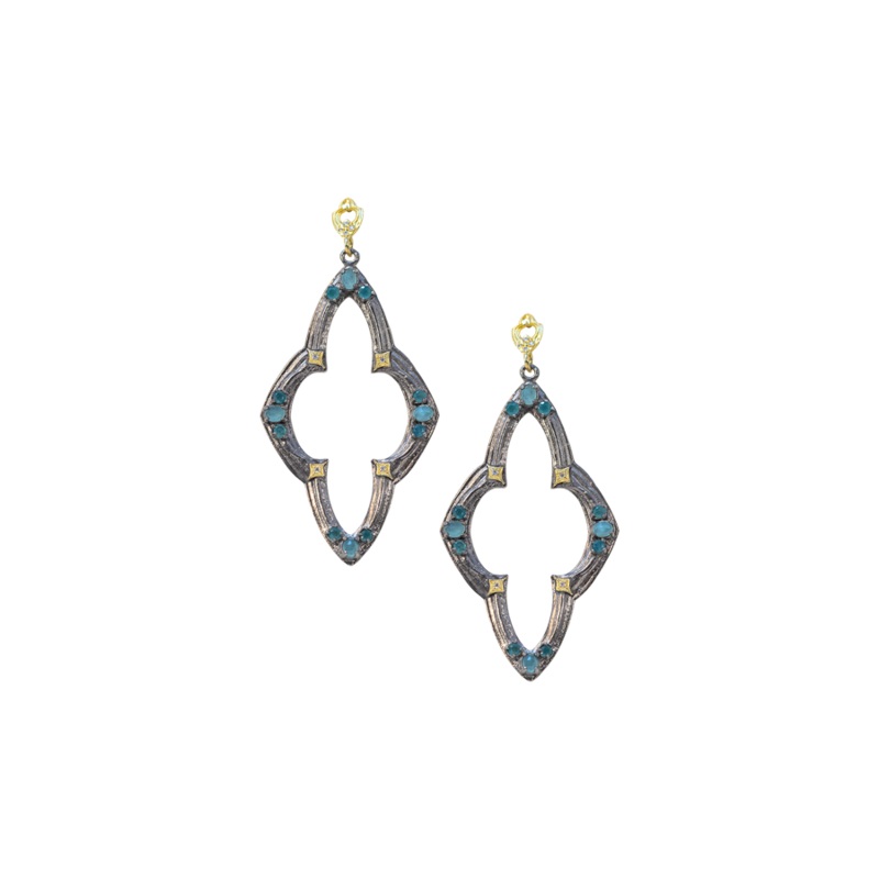 Earring 18k Yellow Gold and Grey Sterling Silver Scroll 64mm With 0.079 CT White Diamonds and Balls Grandidierite on Crivelli Hook.