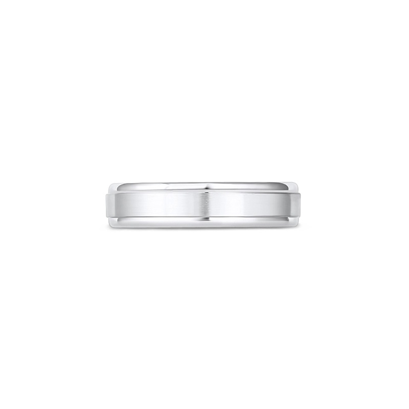 Gents wedding band in 14 karat white gold. The band has a brushed center with high polished rounded, beveled edges. It is 6mm wide