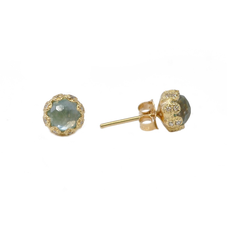 18k Yellow Gold Stud Earringwith 0.15 CT White Diamond Basket and Round Emeralds.