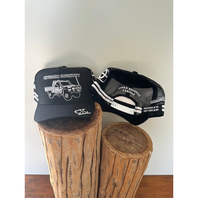 Introducing the “Cruiser Country” Trucker Cap by CTC – a must-have accessory for all cruiser enthusiasts and off-road adventurers. This cap features a sleek black design with an embroidered land cruiser logo on the front, and a land cruiser image under the brim.