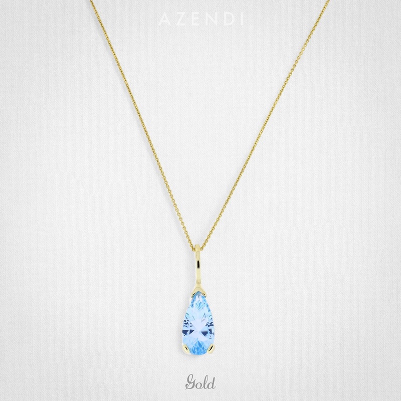 A precision-cut teardrop shapedblue topaz is held in a 9 carat yellow gold setting, allowing light to reflect from every facet of the gemstone.The pendant comes complete on a 9 carat gold anchor chain.