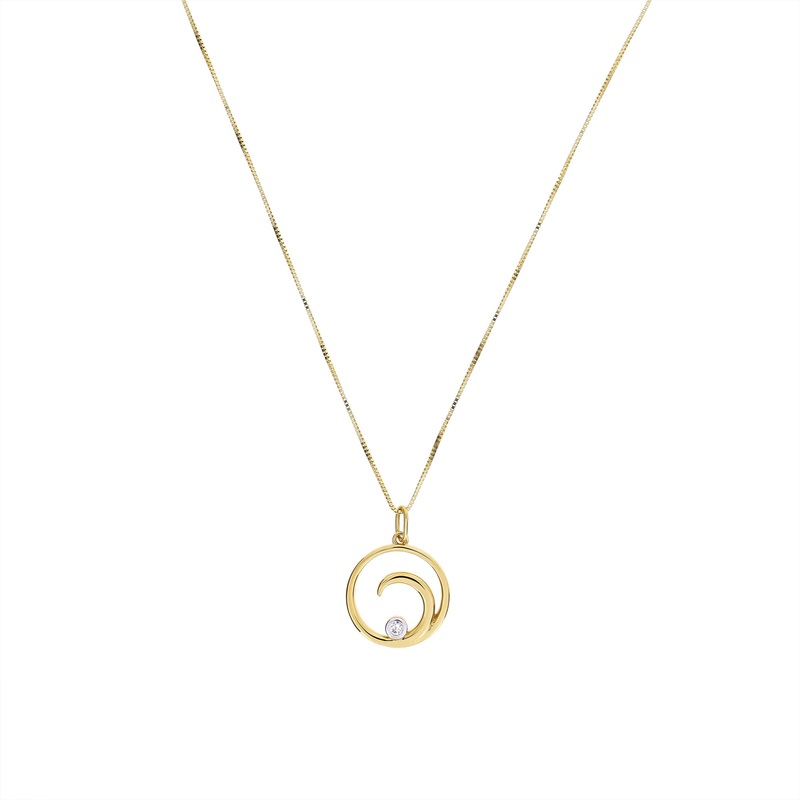 Polished 9 carat yellow gold forms thiscurling wave pendant. The pendant is finished with a single 0.04 carat sparkling diamonds. The diamond is set in 9 carat white gold to highlight the stone.