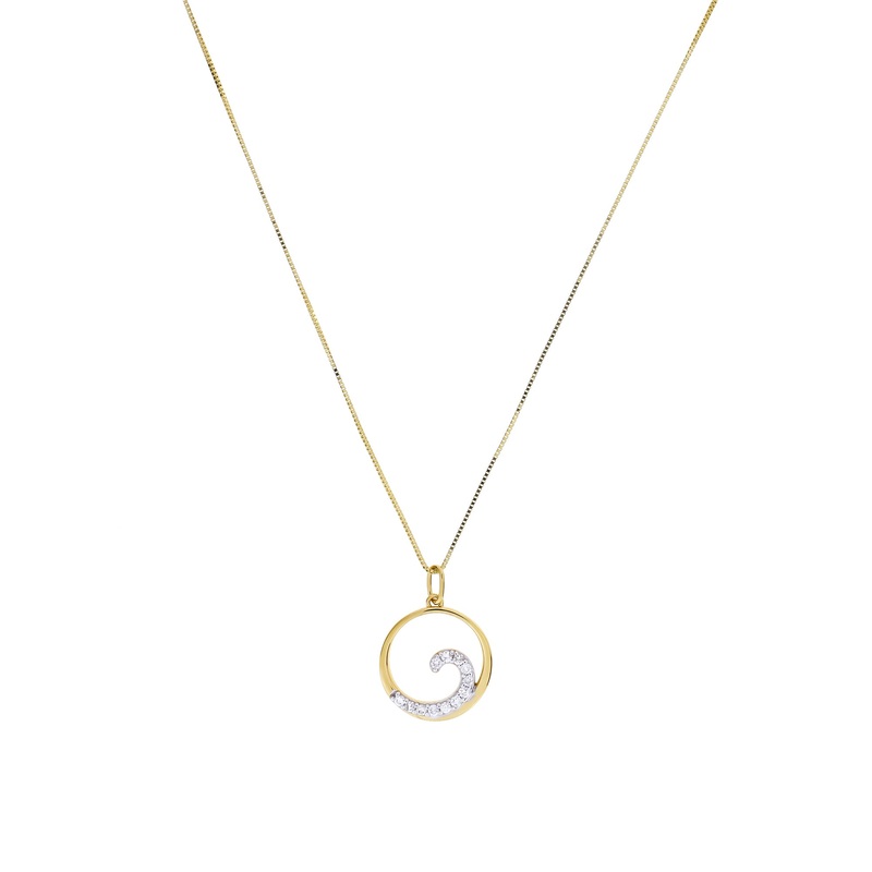 Polished 9 carat yellow gold forms thiscurling wave pendant. The pendant is finished with pavsparkling diamonds, totalling 0.17 carats. The diamonds are set in 9 carat white gold to highlight the stones.