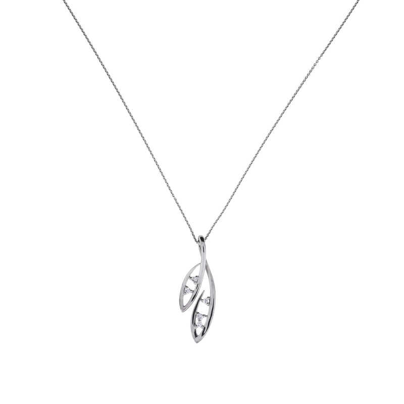 Our white gold and diamonddouble leaf pendant. 0.05 carat diamond total weight.