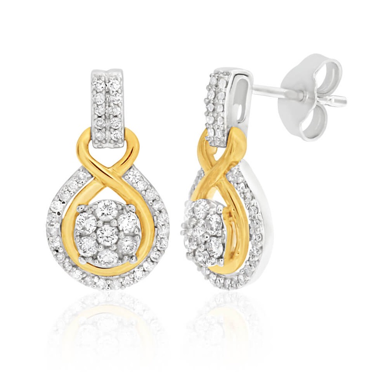 Undeniably beautiful. These 9ct Elegant White Gold Diamond Drop Earrings have a flowing design that’s made to melt hearts. Coated in glistening diamonds, and wrapped in a yellow gold ribbon resembling the infinity sign – these earrings are full of romantic detail. Hosting this collection of sparkly diamonds is a teardrop of 9ct white gold, held by a diamond encrusted stud of the same make. This lush show of colour and brilliance is just waiting to be loved and worn all day.