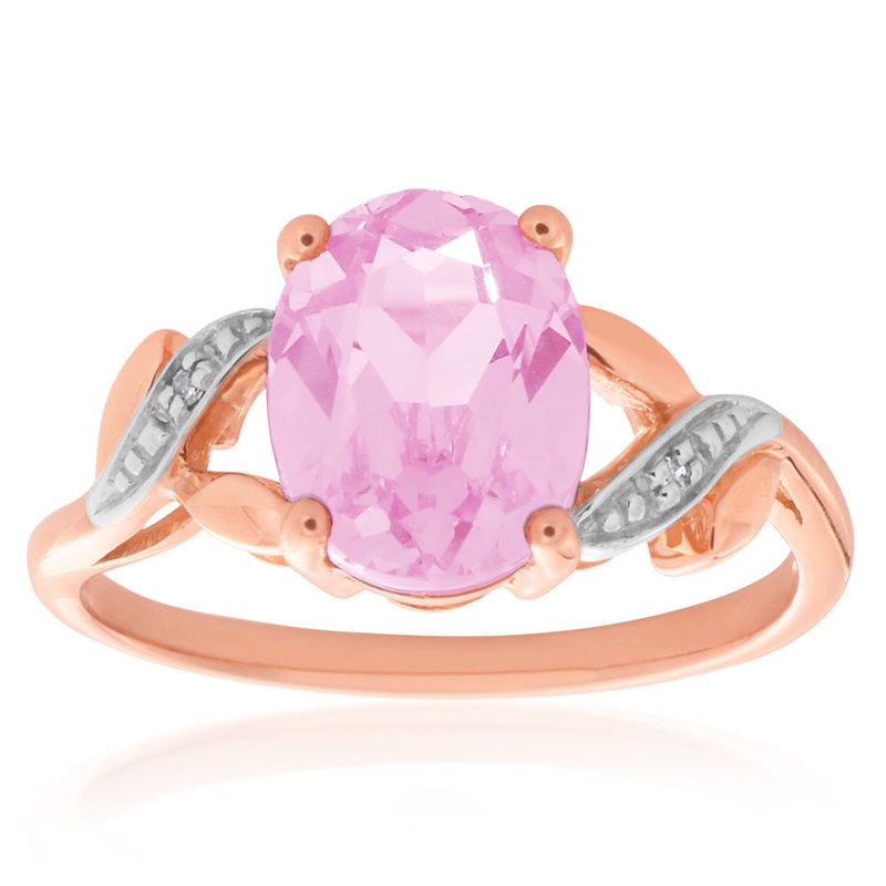 Feel precious in this 9ct Rose Gold Created Peach Sapphire & Diamond Ring. Peach sapphire, created or not, is rarely seen in such an incredible size, nor with such exquisite oval cut. The beautiful colour and glimmer of this fine stone is paramount, making this a truly special ring. Swirls of diamond join this gorgeous peach sapphire, adding contrast to a lavish rose gold band. This ring is simply divine.