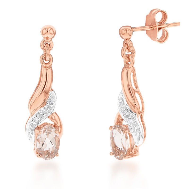 These 9ct Rose Gold Morganite and Diamond Oval Drop Earrings have an elegant design, perfect for formal events and special occasions. Rose gold and morganite are a gorgeous pairing, with soft orange-pink colour and gentle gleam. The morganite stone has been cut into an oval shape and contrasting with a set of shimmering white diamonds for luxury finish.