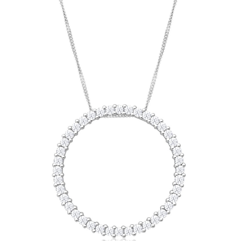 eous circlA simple yet stunning design, this 9ct Superb White Gold Diamond Pendant With Chain is a sparkly and beautiful piece. The pendant is a simple circle that is embedded with glittering stones that sparkle from every angle. Reminiscent of the circle of life, this pendant is a fabulous meaningful gift for someone special. The chain is dainty and delicate making it especially fashionable and emphasising the beauty of the diamonds. This is a piece that can easily be dressed up or down.