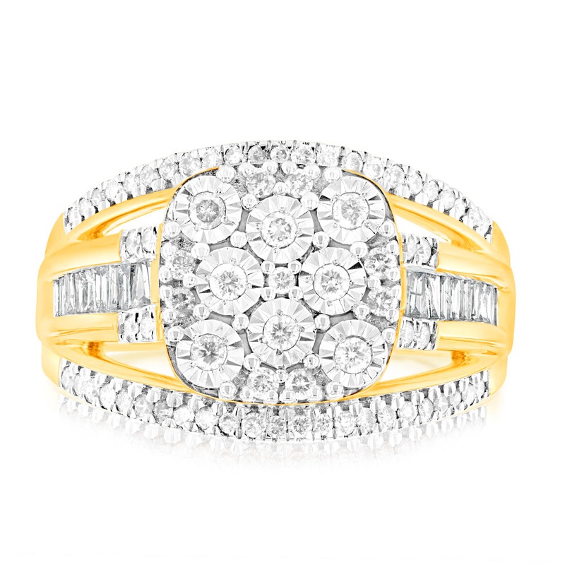 Its all or nothing with this stunning 9ct Yellow Gold Carat Diamond Big Look Dress Ring. Boasting a glorious landscape of diamonds securely set in yellow gold, this dress ring is demanding a big night out. Each diamond is cut with fine precision, highlighting the effort that goes into making a ring this beautiful.