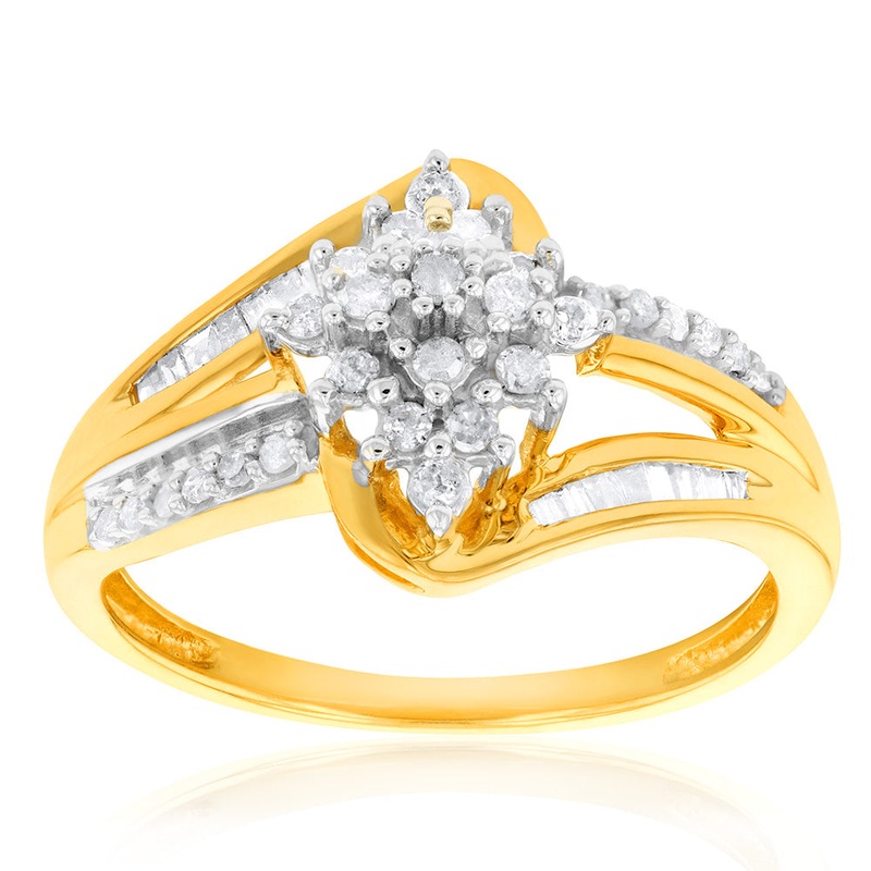 Step out in style with this beautiful 9-carat yellow gold diamond ring. Its the perfect piece to add a sparkle to your everyday look. The ring features an assortment of sparkly brilliant cut diamonds, which have been set into the unique yellow gold band.