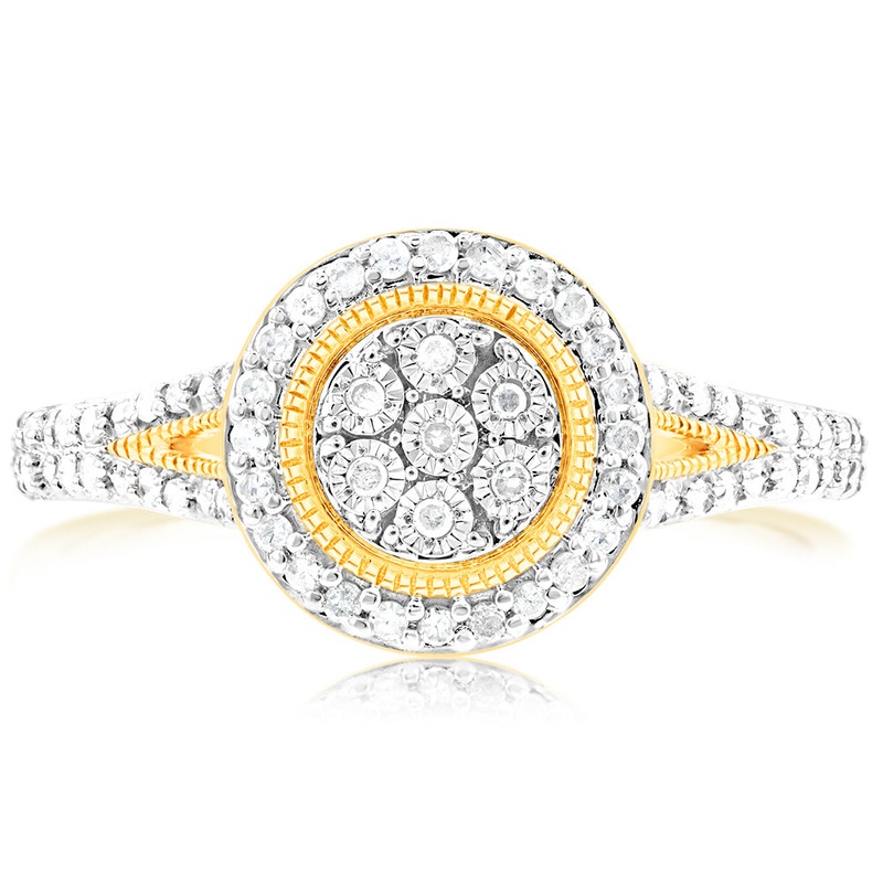 Perfect for fancy nights out, this 9ct Yellow Gold 1/4 Carat Diamond Dress Ring will have you looking as elegant as can be. Boasting a stunning arrangement of diamonds on a durable yellow gold band, this ring is a diamond celebration of beauty. Complete your look with this gorgeous dress ring, bound to grab all attention.