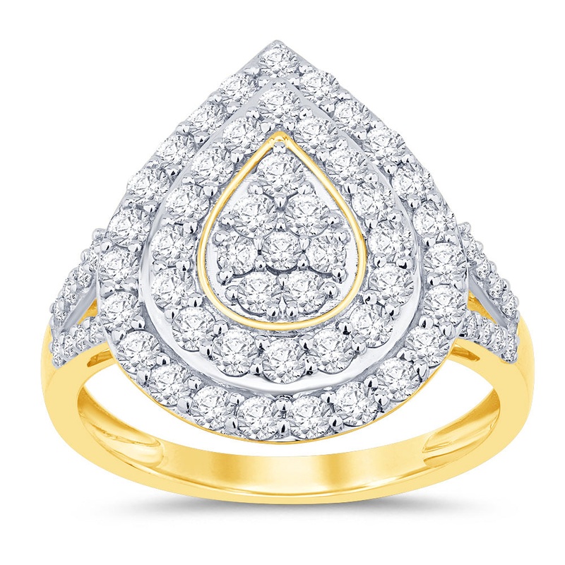 Pear shaped bling is a reflection of the individuality and empowerment of the person who wears it. Shine bright with this 9ct Yellow Gold and 1 Carat of Diamonds Cluster Dress Ring. If you wear a pear-shaped ring, chances are you arent afraid to be different.