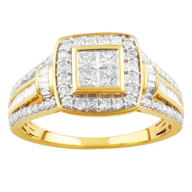 Make a statement with this stunning 9ct Yellow Gold 1 Carat Diamond Ring with Princess Brilliant and Baguette Diamonds. This is a bold piece that is sure to turn heads wherever you go. Complete with both princess brilliant diamonds and baguette diamonds, this ring will sparkle from every angle. The smooth finish of beautiful 9 ct yellow gold makes this ring especially luxurious. A piece that you will treasure for a long time, this ring is one that will be handed down through the generations.