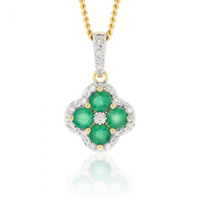 Graceful, vibrant, and lucky, this 9ct Natural Emerald and 0.10ct Diamond 4 Leaf Clover Pendant is designed to give you all the luck you need. This four-leaf clover design is embellished with gorgeous natural emeralds that are known for their beautiful and colourful appearance. The addition of emeralds makes this pendant stunning, and theyre said to offer just a little more good fortune. This yellow gold piece is coated in a layer of diamonds, adding striking contrast and glimmer. Gift this lovable pendant to someone special so that it brings them an abundance of happiness and good fortune.