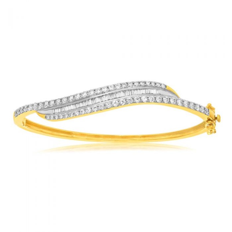 A gorgeous show of jewellery design and gem cutting, this 9ct Yellow Gold 2 Carat Diamond Bangle with Brilliant and Tapered Baguette Diamonds is a statement piece. Its wavy gold band is filled with a beautiful arrangement of diamond cuts, each contributing to an otherworldly glow. This lovely bangle sits comfortably on your wrist, letting you stand out in silky yellow gold.