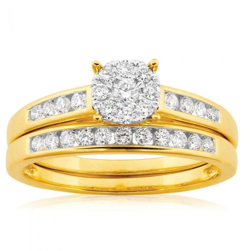 Find the perfect pair in this 9ct Yellow Gold 2 Ring Bridal Set With 1/2 Carats Of Brilliant Cut Diamonds. Boasting a diamond solitaire and channel-set aesthetic, these rings are designed to complement each other perfectly, an