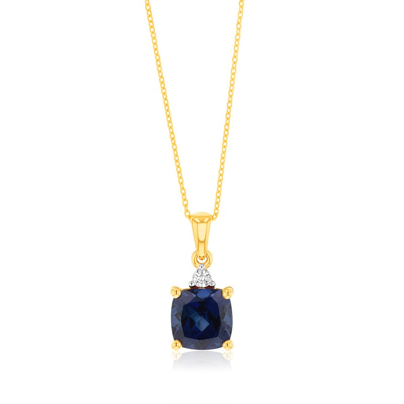 9ct Yellow Gold 2ct Created Blue Sapphire and Diamond Pendant On 45cm Chain
