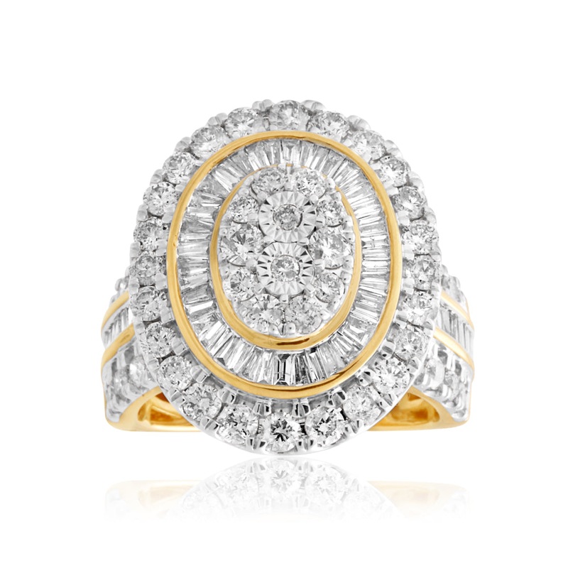 Choose this 9ct Yellow Gold 3 Carat Oval Cluster Diamond Ring with Brilliant & Baguette Diamonds for someone you love. The amazing use of different diamond cuts creates an eye-catching texture that finds light and glimmer from every angle. The oval shape and size of the ring is the perfect way to make a statement, especially paired with the diamond-coated yellow gold band. Diamonds are stones of love, and this piece perfectly expresses the overflowing feelings of affection.