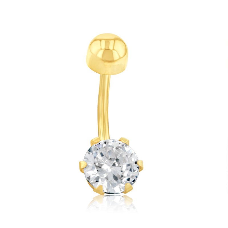 Elegant and eye-catching, this 9ct Yellow Gold 6mm Round Cubic Zirconia 6 Claw Belly Bar is the perfect accessory for any activity. Whether youre wearing a poolside outfit or a party dress, thisbelly bar will show off your glamorous side. Coated with timeless 9ct gold, this classic piece will guarantee a shine from every angle. The gold bar features a stunning bold diamond, making a statement.