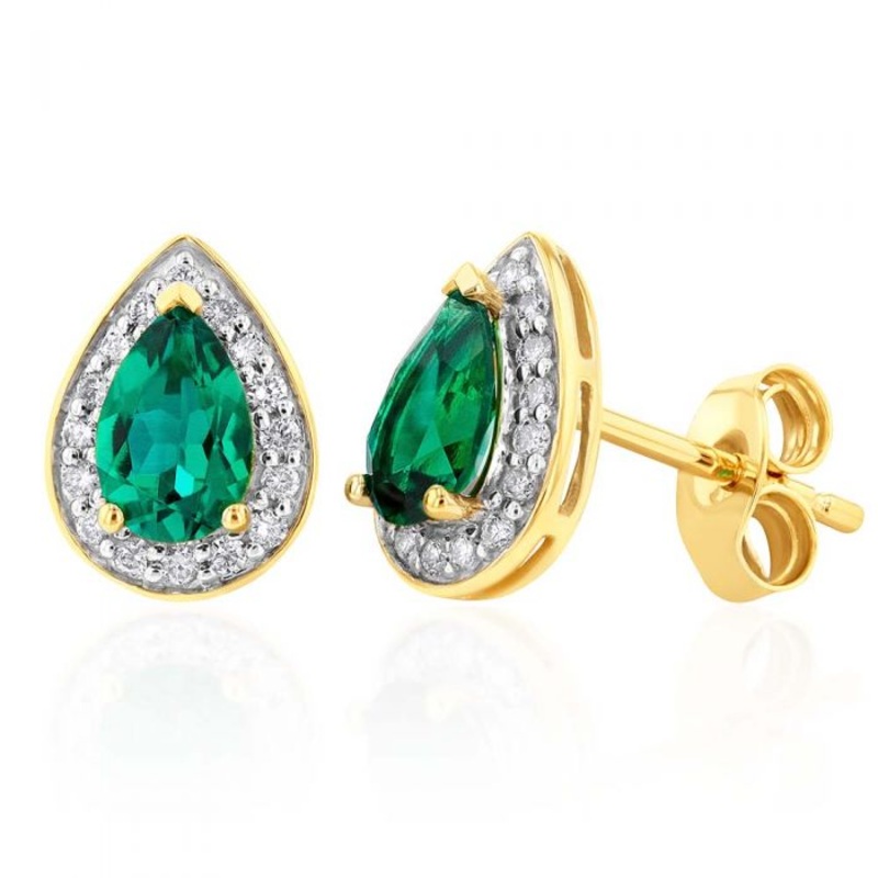 These stunning 9ct Yellow Gold 6x4mm Created Emerald and Diamond Pear Halo Stud Earrings are perfect for everyday wear, adding a touch of elegance to any outfit. These beautiful pear cut emeralds are lab-created, yet chemically identical to mined variants. The earrings are finished with a 9ct yellow gold frame hosting a halo of diamonds for that extra touch of glamour.