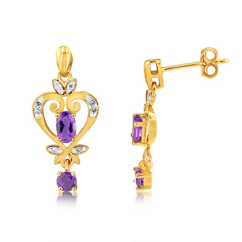 Elegant and sophisticated, these 9ct Yellow Gold Amethyst And Diamond Drop Earrings bring a touch of luxury to any look. Featuring stunning rich purple amethysts set in warm 9ct yellow gold, these earrings are beautifully accented with sparkling diamonds f