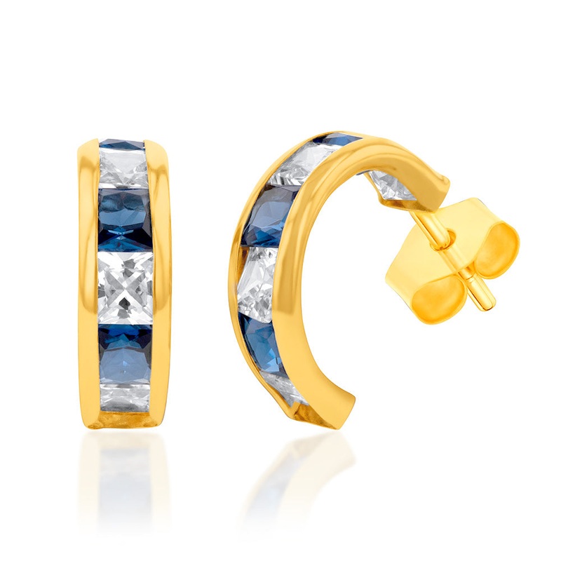 These 9-carat yellow gold half-hoop earrings feature a stunning pattern of blue and white zirconia. This trio of colours is absolutely stunning to see in jewellery and is definitely an eye-catcher. Hoop earrings are one of the most popular styles of earrings due to their versatile style that has stood the test of time for centuries.
