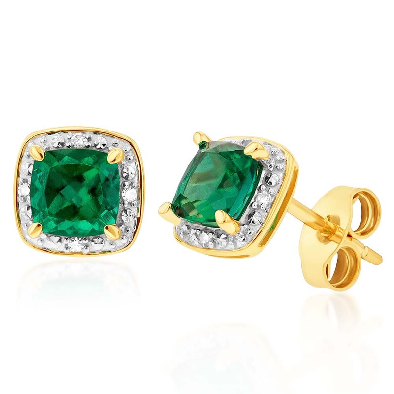 Embrace elegance in these flawless 9ct Yellow Gold 5mm Created Emerald and Diamond Cushion Cut Studs. Emerald is the birthstone for May, making these studs a great gift for someone special. Enjoy the vivid green tones of emerald that you cant achieve anywhere else. Set in a halo setting with the added sparkle of diamonds, these earrings have a vintage tone that is hard to beat. Crafted in the warm tones of yellow gold with a push back clasp, these studs are the finishing touch to your look.