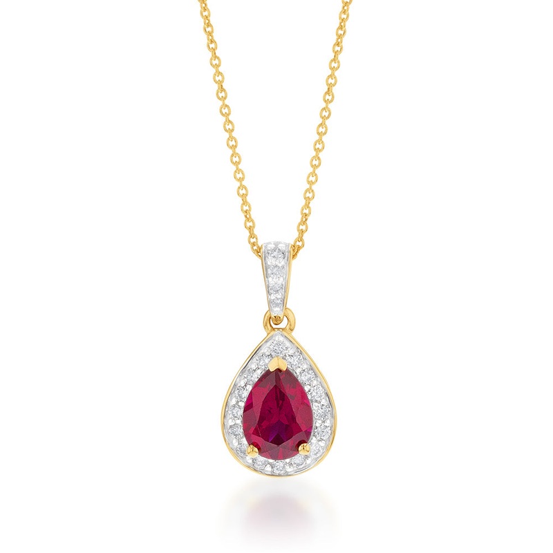 Be the first to review “9ct Yellow Gold Created Ruby 0.15 Carat Diamond Pear Halo Pendant on 45cm Chain”
