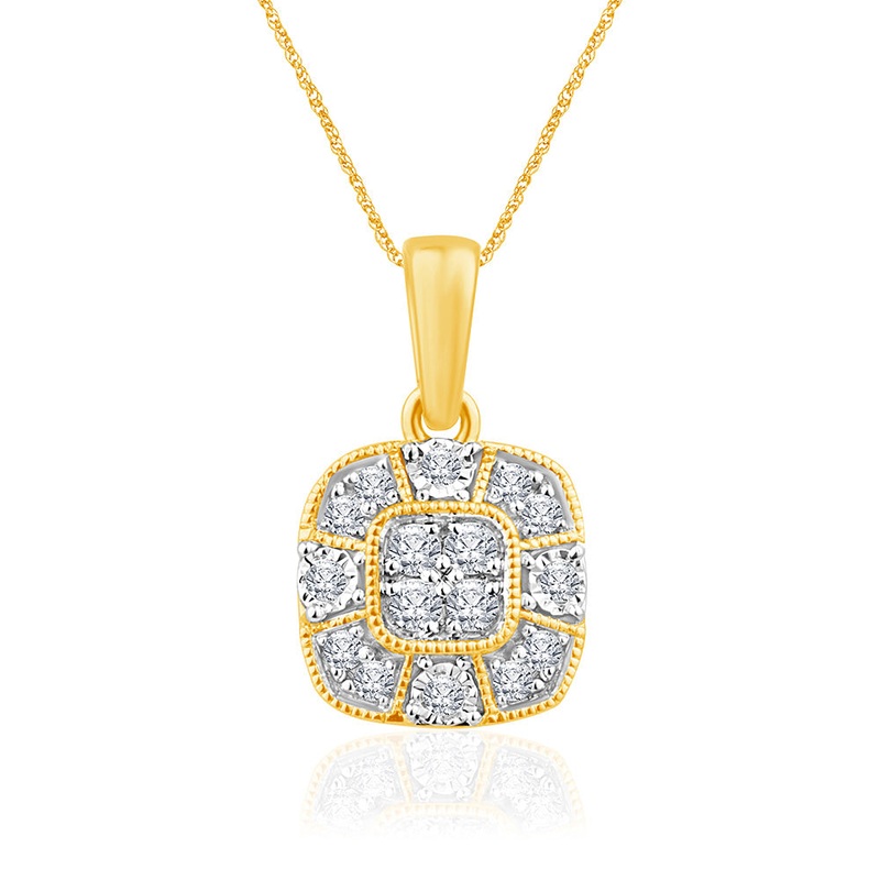 9ct Yellow Gold Cushion Shape Cluster Diamond Pendant on 45cm Chain
