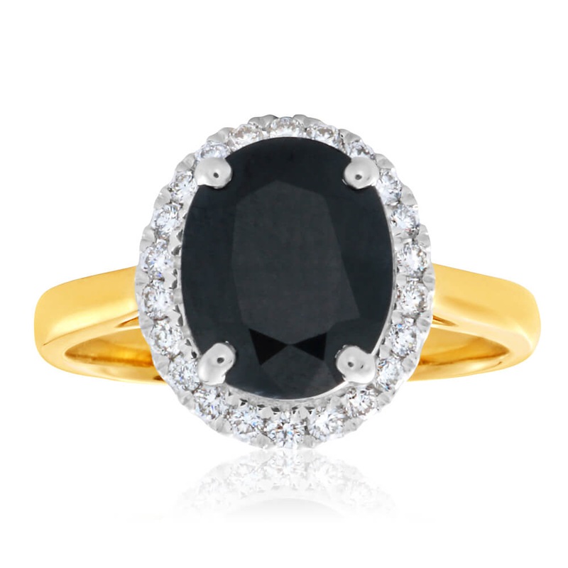 This stunning natural sapphire and diamond ring is sure to make a statement. The 1/4 Carat of stunning diamonds, the 9ct yellow gold ring is a modern must-have. Please contact us regarding special order enquiries for this ring. All ring sizes can be specially ordered, with delivery approximately 6-8 weeks.
