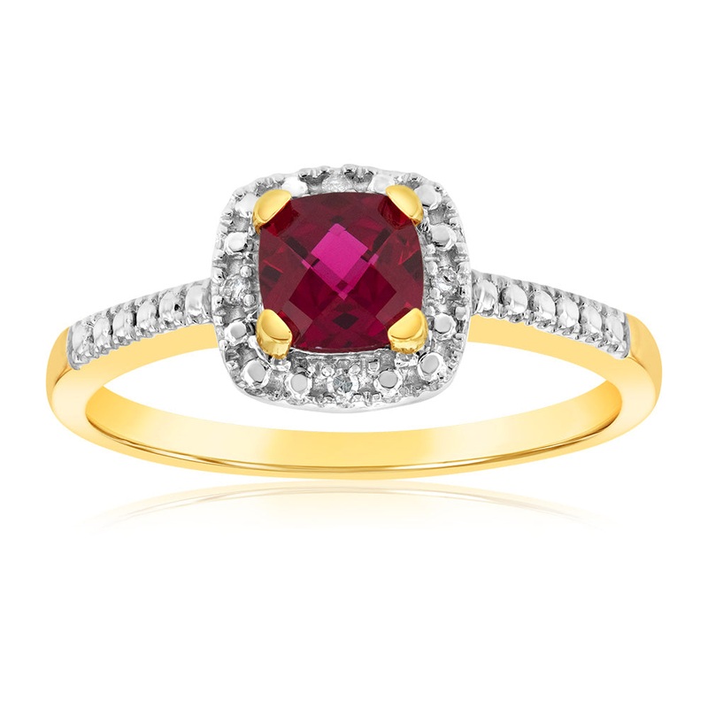 Make a statement with the breathtaking 9ct Yellow Gold Diamond and Created Ruby Ring featuring a stunning cushion cut halo design. Crafted with 9ct yellow gold, this ring showcases a vibrant created ruby as the centrepiece, surrounded by a sparkling halo of diamonds. The cushion cut adds a touch of sophistication and elegance to the design. The combination of the fiery red created ruby and the dazzling diamonds creates a captivating and luxurious piece of jewellery. Perfect for special occasions or as a symbol of love and devotion, the 9ct Yellow Gold Diamond and Created Ruby Ring with its cushion cut halo design is sure to turn heads and leave a lasting impression.