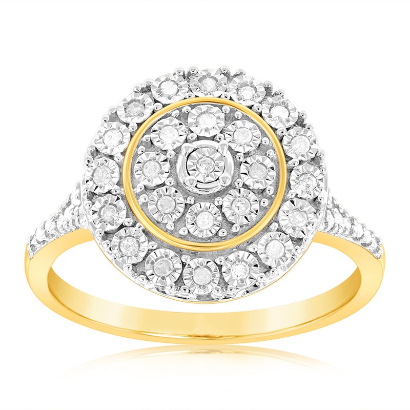 Make a statement with this 9ct Yellow Gold Diamond Ring With 35 Brilliant Cut Diamonds. The ring is brilliance at its peak, showcasing a bold display of valuable diamonds on 9ct yellow gold. The ring is symmetrical, ensuring a flawless appeal from every angle. Bring the wow-factor to your outfit and seal the fashion deal with this beloved diamond ring.