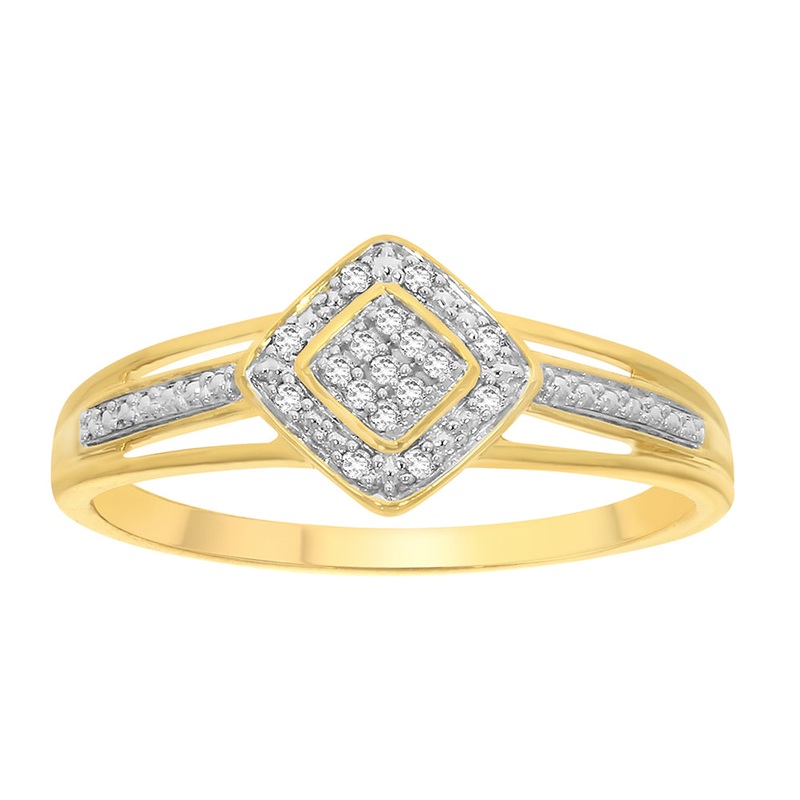 This gorgeous 9ct Yellow Gold Diamond Split Shank Ring features beautiful architecture. The diamond shaped centrepiece is filled with real diamonds, with all the glimmer and shine you'd expect. Thin layers of yellow gold between the diamond channels add a