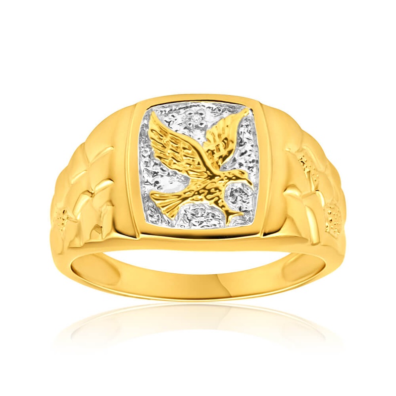 This gents ring is chic and contemporary. Featuring a unique eagle, the 9ct yellow gold ring is the perfect accessory for the modern gent.