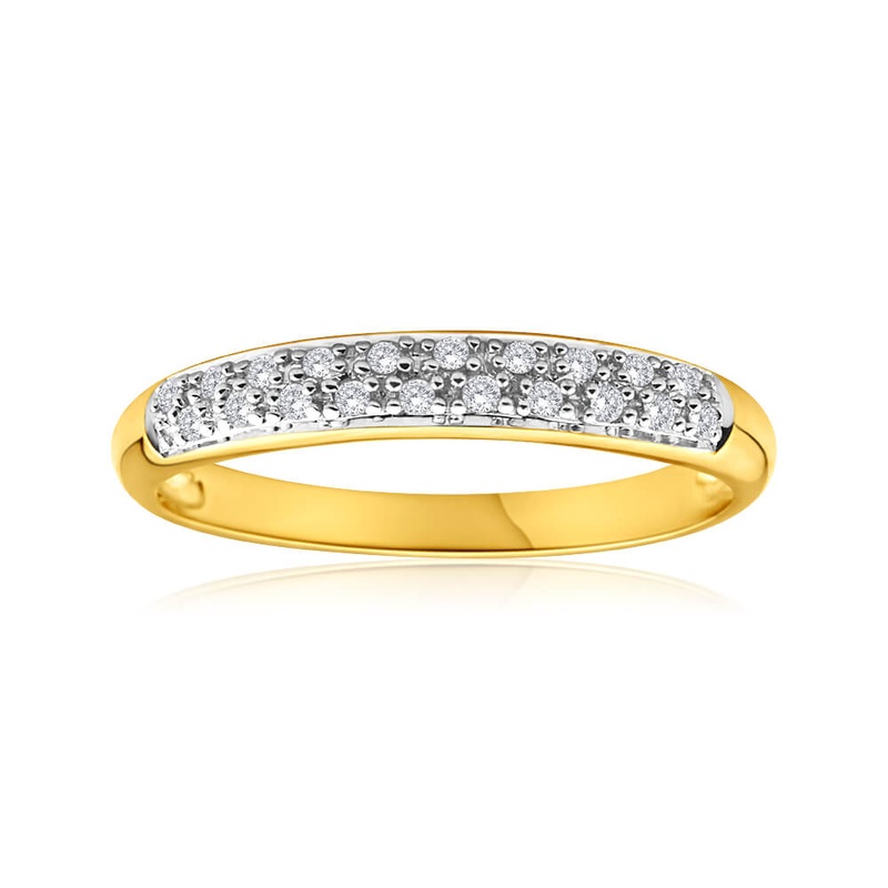 This 9ct Yellow Gold Impressive Diamond Ring holds a precious collection of brilliant cut diamonds. Both rows of gemstones are carefully placed in a passage of white gold, contrasting the richness of the yellow gold band. Together, the elements of this fine ring create a stunning complementary piece that will complete any look.