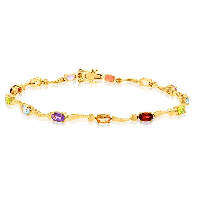 Step out in unwavering style with this stunning 9ct Yellow Gold Multi-coloured Gemstones Wave Bracelet. Crafted in the warm tones of yellow gold with a smooth finish and shiny lustre, this bracelet is perfect for everyday wear and gives your look a luxurio
