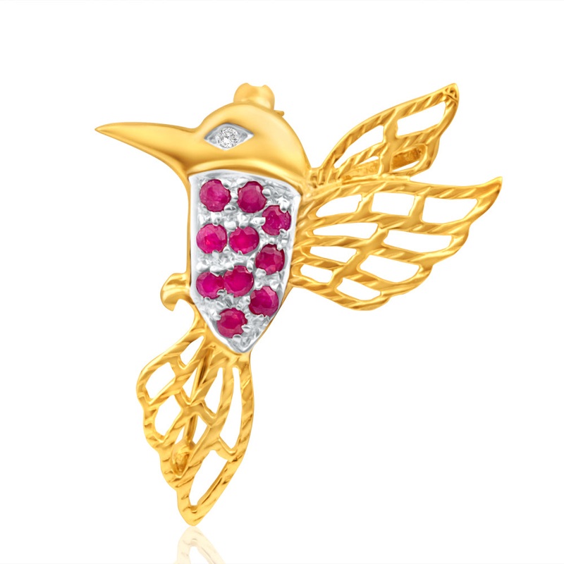 9ct Yellow Gold Natural Ruby and Diamond Hummingbird Brooch