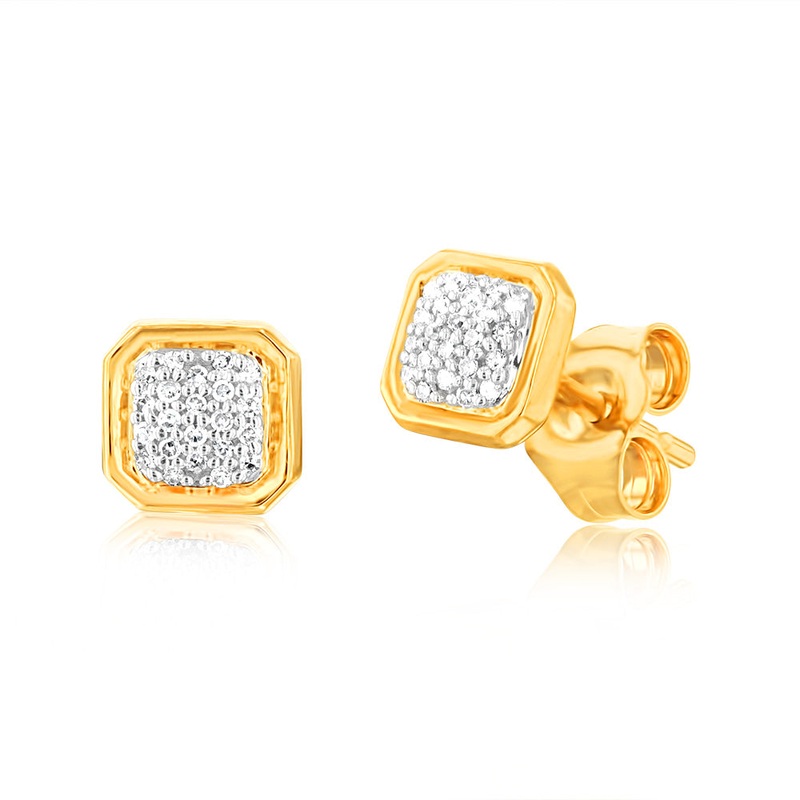 9ct Yellow Gold Square Shaped Cluster Stud Diamond Earrings