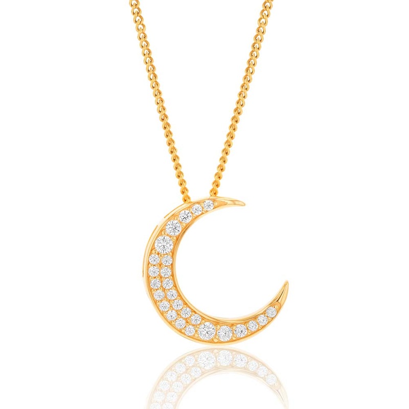 This stunning 9-carat yellow gold crescent moon pendant is the perfect way to add a touch of glamour to any outfit. The crescent moon is set with sparkling cubic zirconia stones, which brilliantly catch the light and sparkle. Whether youre dressing up for a special occasion or just want to add a touch of sparkle to your everyday look, this pendant is the perfect choice.