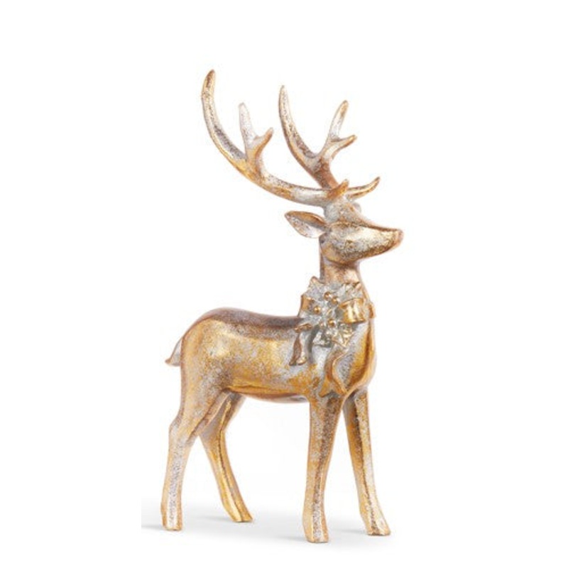 Gorgeous, aged gold deer with bow ornaments. They are made of resin but shimmer like pure gold. They will command your attention standing or hanging. Two styles – bow on right and bow on left.