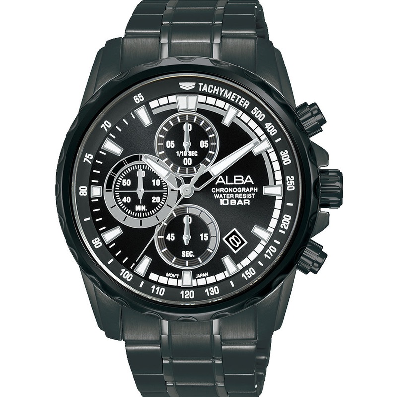Introducing the Alba Active AM3921X Chronograph, an all-black watch designed for both style and functionality. Powered by the reliable Caliber VD57 quartz movement, this timepiece ensures accurate timekeeping with the convenience of battery power. The 43mm stainless steel case and bracelet are finished in sleek black, providing durability and a modern aesthetic suitable for various occasions.Equipped with a pull-out crown for easy adjustments, this watch features a practical date display for added functionality. A mineral crystal protects the dial from scratches while maintaining clear visibility. With water resistance up to 100 meters, it is suitable for swimming and water sports, adding versatility to its design.The Alba Active AM3921X Chronograph combines a bold all-black appearance with robust features, making it an excellent choice for individuals who value both style and performance in their timepiece. Whether for casual wear or active lifestyles, this watch stands out with its sleek design and reliable functionality.- Caliber VD57- Quartz powered by a battery – 43mm Case Size – Stainless Steel Case and Bracelet- Pull Out Crown – Date Display – Mineral Crystal – 100 Meters Water Resistant