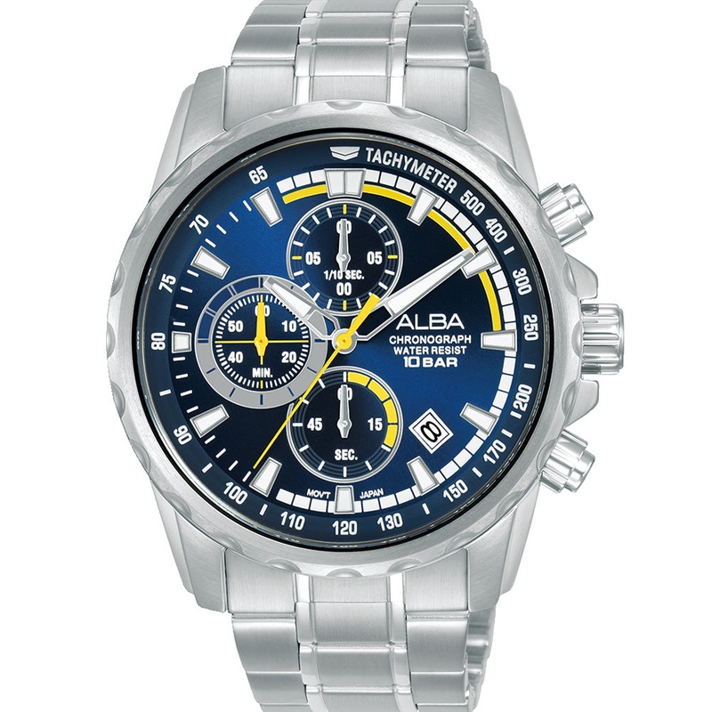 Introducing the Alba Active AM3929X1 Chronograph with a vibrant blue sunray dial, a versatile and robust timepiece designed for active individuals. Powered by the reliable Caliber VD57 quartz movement, this watch ensures precise timekeeping powered by a battery. The 43mm stainless steel case and bracelet offer durability and a modern aesthetic, suitable for both casual and sporty occasions.Featuring a pull-out crown for easy adjustments, it includes a practical date display for added convenience. A mineral crystal protects the dial from scratches while maintaining clarity. With water resistance up to 100 meters, this watch is well-equipped for water activities such as swimming and snorkelling, adding to its versatility. The Alba Active AM3929X1 Chronograph combines functionality with a bold design, making it an ideal companion for those who lead active lifestyles while seeking style and reliability in their timepiece.- Caliber VD57- Quartz powered by a battery – 43mm Case Size – Stainless Steel Case and Bracelet – Pull Out Crown – Date Display – Mineral Crystal – 100 Meters Water Resistant