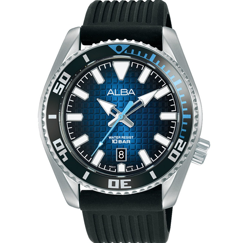 Introducing the Alba Active AS9P09X, a dynamic timepiece featuring a striking blue patterned dial with a bezel in black, blue, silver, and black hues, paired with a comfortable black silicone strap. This watch combines sporty aesthetics with functionality, ideal for active lifestyles.Equipped with the precise Caliber VJ42 quartz movement, the AS9P09X ensures accurate timekeeping powered by a reliable battery. The 43.5mm stainless steel case provides durability and a modern look, complemented by a pull-out crown for easy adjustments.Protected by a mineral crystal, the dial maintains clarity and resists scratches, suitable for everyday wear and outdoor activities. A practical date display enhances its functionality, while water resistance up to 100 meters allows for swimming and water sports.The Alba Active AS9P09X is designed for those who seek both style and performance in their timepiece, offering versatility and durability for various occasions.- Caliber VJ42- 43.5mm Case Size – Stainless Steel Case- Silicone Strap- Pull Out Crown – Mineral Crystal – Rotating Bezel – Two Way- Date Display- 100 Meters Water Resistant