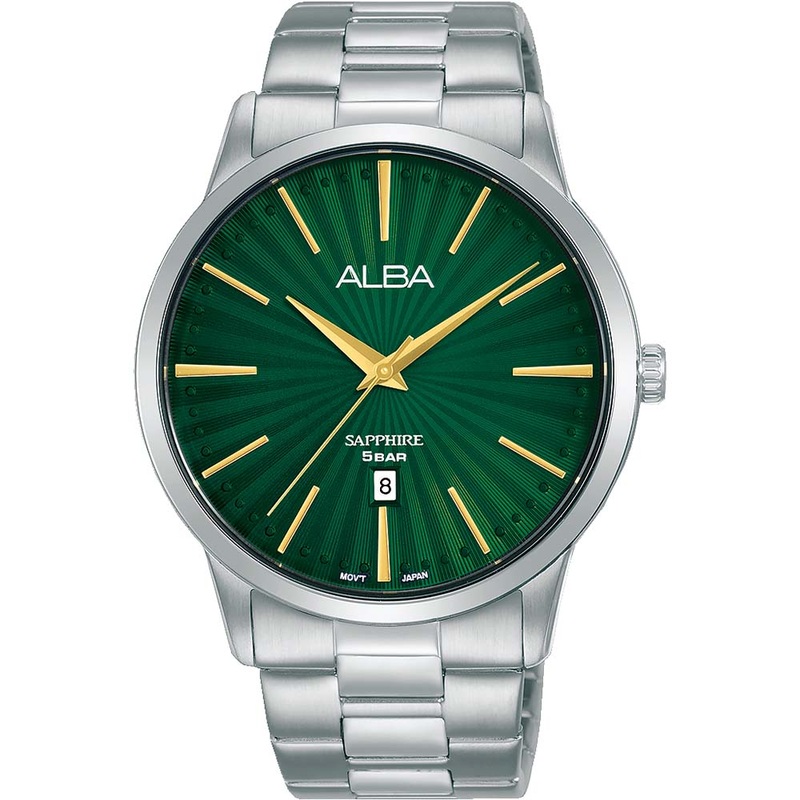 This Alba AG8K91X1 Stainless Steel Mens Watch has a striking emerald colour dial to match its scratch-proof sapphire glass. Set against a stainless steel case, and detailed with gold tone hands and indexes, this vibrant dial is sure to catch glances. This stylish timepiece is a fantastic choice for formal events, with its tough durability and sophisticated look.