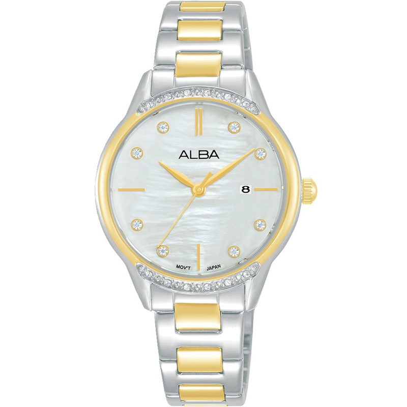 The Alba AH7AQ2X features a two-tone silver and gold case and bracelet that has been crafted from stainless steel. The bezel is gold with clear gemstones that complement the silver colour of the stainless steel. The dial is white mother of pearl which gives it a unique finish and texture. Eight of the hour markers are indicated by a shiny gemstone and four of them are gold matching the watch hands. The watch dial features a date window for added functionality.