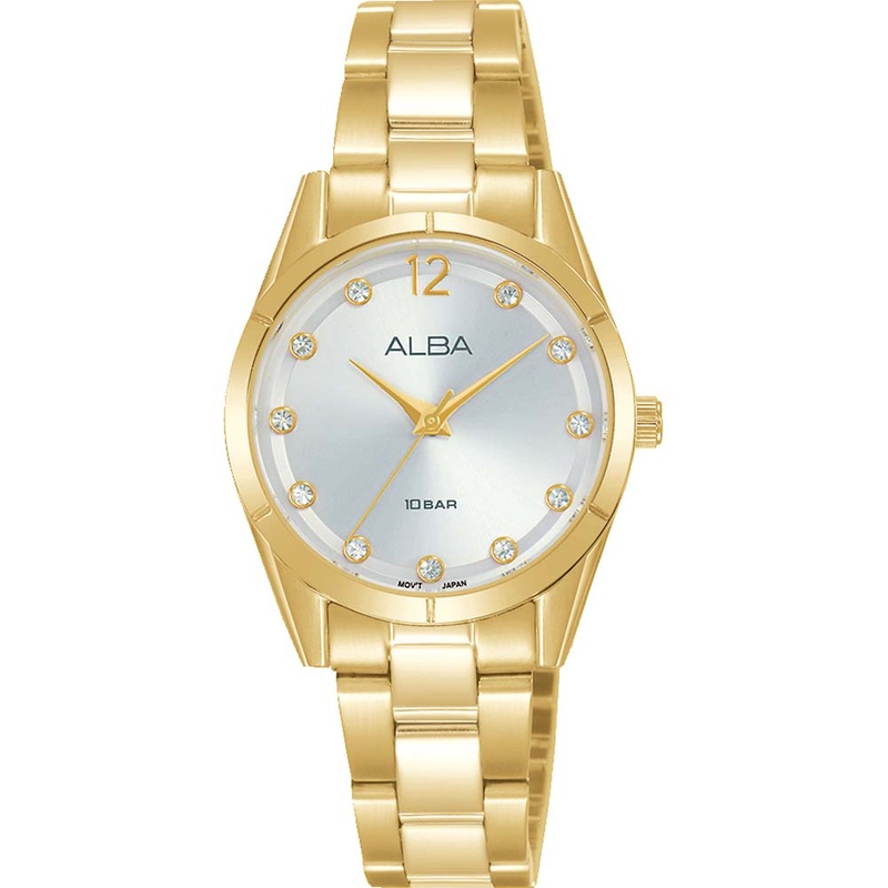 A classic piece, this gorgeous Alba AH8740X1 Crystal Stone Set Womens Watch is a staple in any women’s watch collection. Finished in gold plated stainless steel with a shiny lustre and unmissable gold tone, this watch can be dressed both up and down to take you from day to night with ease. The round dial features a pearly white finish that is embellished with sparkling stones. The hands are dainty and gold, contrasting the dial. This watch features a 100 metre water resistance, which means that you can undertake your day to day activities with ease.