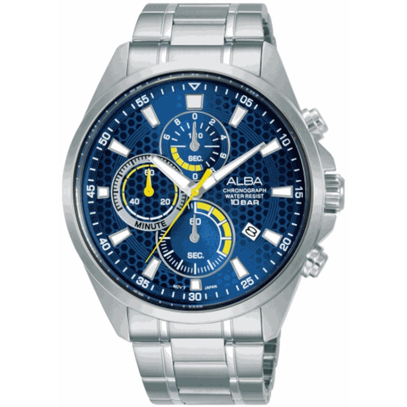 The Alba AM3873X Chronograph with a navy-blue dial combines functionality and style seamlessly. Featuring a precise chronograph with hour, minute, second, and sub-hands, it boasts a 60-minute chronograph accurate to 1/10 second, ideal for precise timekeeping needs. The 43mm stainless steel case provides durability and a sleek aesthetic, complemented by a matching stainless-steel bracelet for a refined look. A date display enhances its practicality, while a mineral crystal ensures scratch resistance and clarity. With water resistance up to 100 meters, this timepiece is suitable for everyday wear and outdoor activities, promising reliability in various environments.- Functions: Chronograph with hour, minute, second, sub-hands, 60-minute chronograph accurate to 1/10 second Split time- 43mm Case Size – Stainless Steel Case and Bracelet- Date Display – Mineral Crystal – 100 Meters Water Resistant