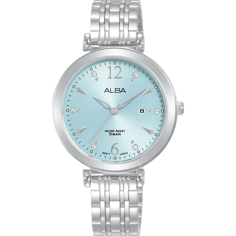 Introducing the Alba Fashion AH7BW5X with a pale blue sunray dial, a charming timepiece that combines elegance with practicality. Powered by the dependable Caliber VJ22 quartz movement, this watch operates on battery power for accurate timekeeping. The 32mm stainless steel case and bracelet offer durability and a refined look suitable for everyday wear.Featuring a pull-out crown for easy adjustment, it includes a date display for added functionality. Adorned with 6 crystals around the dial, it adds a subtle hint of sparkle while maintaining a minimalist appeal. A mineral crystal ensures scratch resistance, ensuring clarity and durability over time. With water resistance up to 50 meters, this watch is designed to withstand splashes and brief immersion, making it versatile for various activities. The Alba Fashion AH7BW5X is a stylish choice that complements any outfit with its understated elegance and practical features.- Caliber VJ22- Quartz powered by a battery – 32mm Case Size – Stainless Steel Case and Bracelet – Pull Out Crown – Date Display- 6 Crystals – Mineral Crystal – 50 Meters Water Resistant